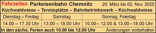 Die Parkeisenbahn Chemnitz befindet sich im romantischen Küchwaldpark inmitten der Stadt. Im Jahr 1954 drehte die kleine Eisenbahn mit 600 mm Spurweite ihre ersten Runden. Heute rollen die kleine Züge auf einem 2,3 km langen Rundkurs, der über zwei Haltepunkte und einen Bahnhof verfügt. Mehr als 100.000 Besucher sind alljährlich Fahrgäste der Attraktion auf Schienen. Kinder und Jugendliche, die künftig Eisenbahner sein möchten, bereiten sich hier auf ihren Beruf vor. Ein modernes Bahnbetriebswerk mit Lok- und Wagenhalle, Veranstaltungsräumen, Café und großer Gartenbahnanlage gehört zu den Anziehungspunkten am Schienenstrang. Seit Bestehen lebt die kleine Bahn vom großen ehrenamtlichen Engagement vieler Eisenbahnfreunde. Besondere Unterstützung erhält sie von engagierten Chemnitzer Firmen, die Gesellschafter der Parkeisenbahn sind.
