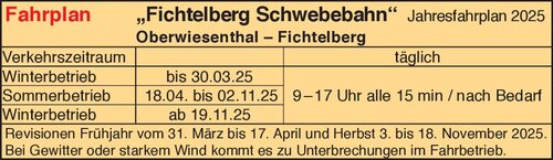 Während den Revisionszeiten ist kein Fahrbetrieb der Fichtelberg Schwebebahn möglich. | |||